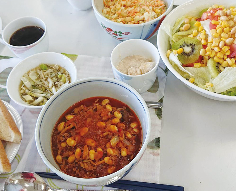チリコンカン、人参とキャベツのコールスロー、おからとバナナヨーグルト、腸活サラダ、めかぶと白菜のスープ