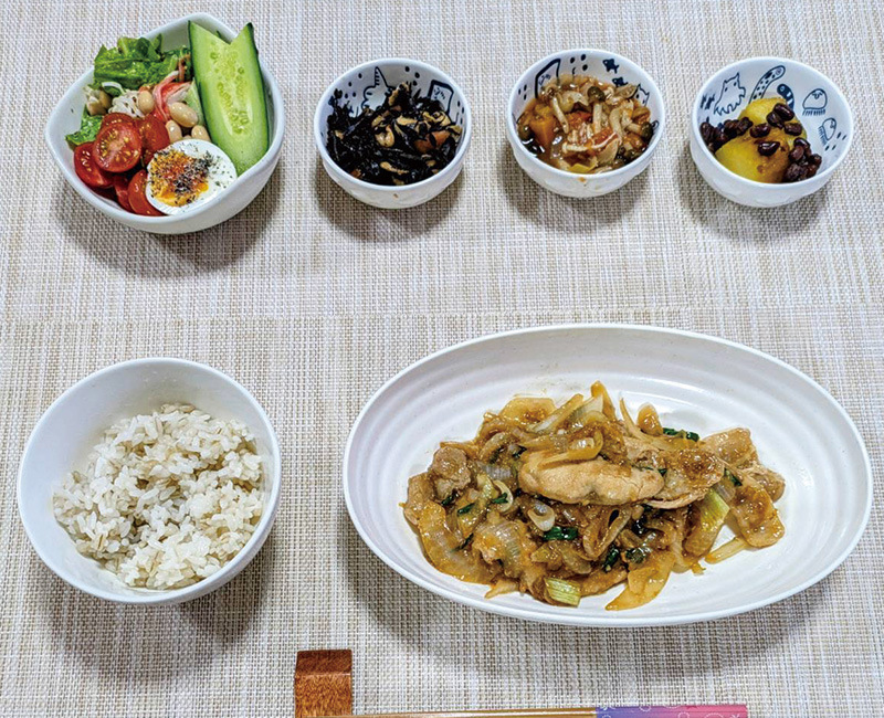 もち麦ごはん、新玉葱の豚肉の生姜焼き、彩りサラダ🥗カニカマと新玉葱、サラダ菜のマスタード和え、ひじき煮、サーカディアンスープ、さつまいも🍠と小豆